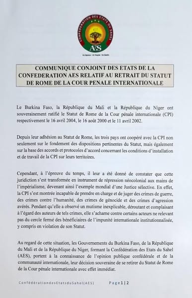 AccueilEconomie - PolitiqueCOMMUNIQUÉ CONJOINT DE LA CONFÉDÉRATION AES RELATIF AU RETRAIT DU STATUT DE... Economie - PolitiqueUne COMMUNIQUÉ CONJOINT DE LA CONFÉDÉRATION AES RELATIF AU RETRAIT DU STATUT DE ROME DE LA COUR PÉNALE INTERNATIONALE By Abi BARRO 23 septembre 2025 0 46 Partager FacebookTwitterPinterestWhatsApp Source: Ministère des Affaires Etrangères du Burkina Faso Partager FacebookTwitterPinterestWhatsApp Article précédentReconnaissance de la Palestine : le discours en intégralité d’Emmanuel Macron à l’ONUArticle suivant𝟖𝟎ᵉ 𝐚𝐧𝐧𝐢𝐯𝐞𝐫𝐬𝐚𝐢𝐫𝐞 𝐝𝐞 𝐥’𝐎𝐍𝐔 : 𝐮𝐧𝐞 𝐜𝐨𝐦𝐦𝐞́𝐦𝐨𝐫𝐚𝐭𝐢𝐨𝐧 𝐞𝐦𝐩𝐫𝐞𝐢𝐧𝐭𝐞 𝐝𝐞 𝐦𝐞́𝐦𝐨𝐢𝐫𝐞 𝐞𝐭 𝐝𝐞 𝐯𝐢𝐬𝐢𝐨𝐧 Abi BARRO RELATED ARTICLES Economie - Politique Burkina : GRAND ENTRETIEN DU PRÉSIDENT DU FASO 29 septembre 2025 Conseil de Ministre - Diplomatie 80e Assemblée générale des Nations Unies: Déclaration du Burkina Faso prononcée par le Premier ministre Chef du gouvernement SEM Rimtalba Jean Emmanuel OUEDRAOGO 29 septembre 2025 Bien être - Sport - Mode Le Parisien Ousmane Dembélé est le Ballon d’or 2025 ! 23 septembre 2025 LAISSER UN COMMENTAIRE Annuler la réponse Commenter : S'il vous plaît entrez votre commentaire! Nom :* S'il vous plaît entrez votre nom ici Email :* Vous avez entré une adresse email incorrecte! Veuillez entrer votre adresse email ici Site : Enregistrer mon nom, email et site web dans ce navigateur pour la prochaine fois que je commenterai. Most Popular Burkina : GRAND ENTRETIEN DU PRÉSIDENT DU FASO 29 septembre 2025 80e Assemblée générale des Nations Unies: Déclaration du Burkina Faso prononcée par le Premier ministre Chef du gouvernement SEM Rimtalba Jean Emmanuel OUEDRAOGO 29 septembre 2025 Le Parisien Ousmane Dembélé est le Ballon d’or 2025 ! 23 septembre 2025 𝟖𝟎ᵉ 𝐚𝐧𝐧𝐢𝐯𝐞𝐫𝐬𝐚𝐢𝐫𝐞 𝐝𝐞 𝐥’𝐎𝐍𝐔 : 𝐮𝐧𝐞 𝐜𝐨𝐦𝐦𝐞́𝐦𝐨𝐫𝐚𝐭𝐢𝐨𝐧 𝐞𝐦𝐩𝐫𝐞𝐢𝐧𝐭𝐞 𝐝𝐞 𝐦𝐞́𝐦𝐨𝐢𝐫𝐞 𝐞𝐭 𝐝𝐞 𝐯𝐢𝐬𝐢𝐨𝐧 23 septembre 2025 Voir plus Recent Comments