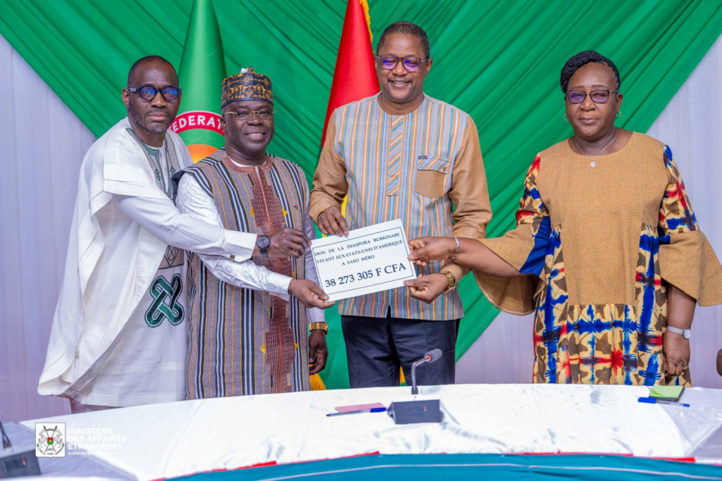 Le ministre des Affaires étrangères, SEM Karamoko Jean Marie TRAORE, accompagné du ministre délégué, Mme Bêbgnasgnan Eldine KABRE/KABORE a présidé, dans la soirée du 27 janvier 2026, une cérémonie de remise de contribution au Fonds de Soutien patriotique et à l’Agence Faso Mêbo, par deux délégations de la diaspora, d’un montant total 42 millions 719 169 francs CFA.